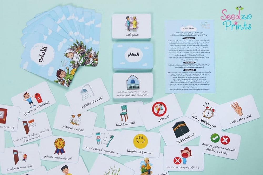 2- لعبة تعليمية تساعد الطفل على حفظ الآداب بطريقة شيقة عبارة عن 15 كارت من كروت الآداب و 74 كارت من كروت المهام ويتم اللعب ب 3 طرق مختلفة