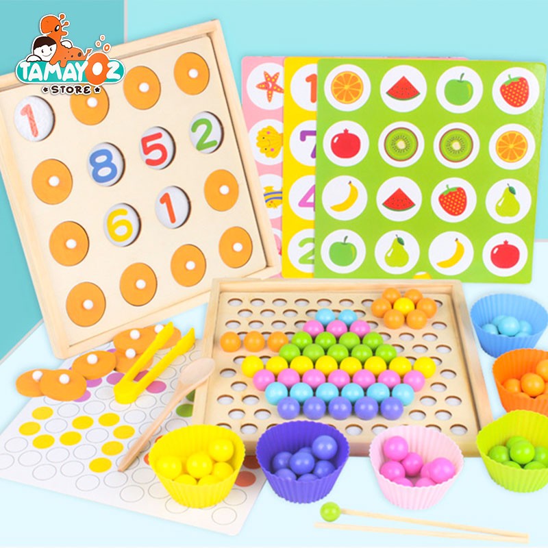 وهي بتحتوى على 6 اكواب و72 كورة _معلقة خشبية لحمل الكور _ الملقاط الخشبي _العيصان الخشبية .. وكل واحد منهم عشان يصعب التحدي على طفلك ويقويه اكتر😉❣️