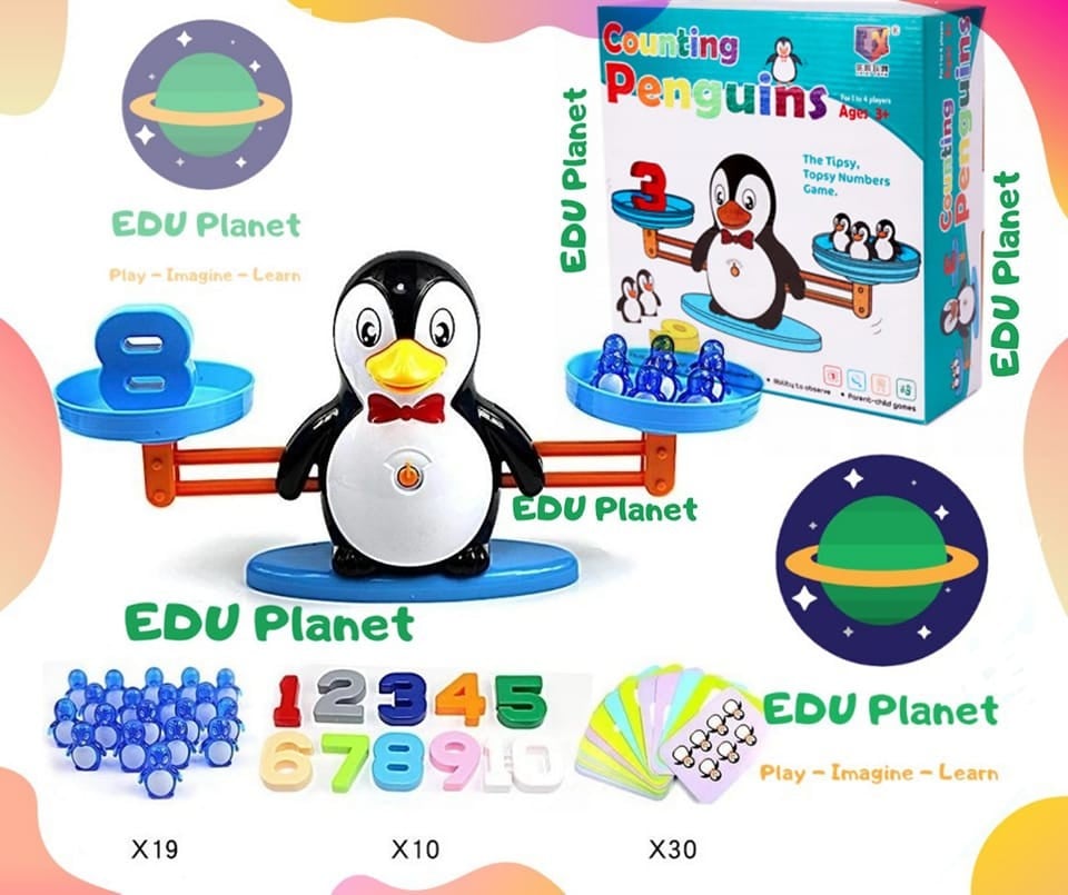 🔹 المكون: ميزان بطريق ، لوحتين ، 19 شخصية بطريق ، 10 أرقام ، 30 بطاقة ، دليل.